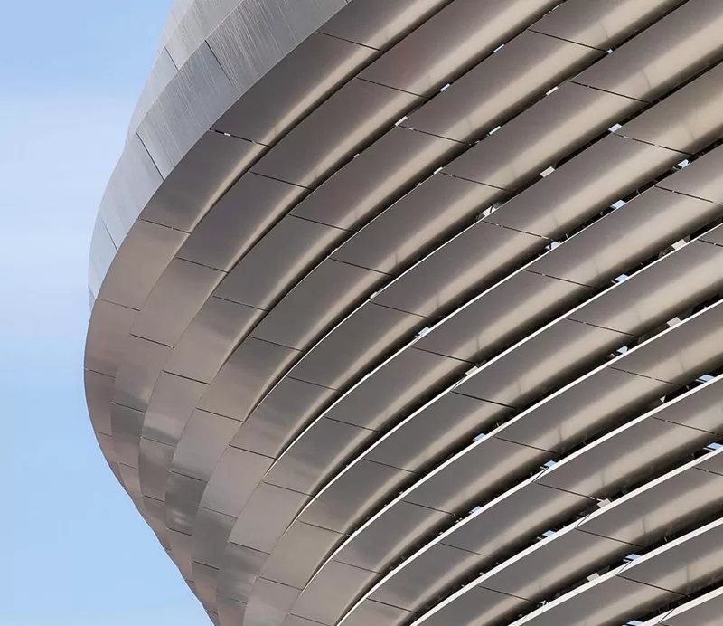 The horizontal gaps between the metal slats on the building facade ensure natural ventilation while also blocking out strong sunlight. Stainless steel, with its inherent metallic luster and clean, uncluttered appearance, provides shade, ventilation, and privacy, while also adding aesthetic appeal to the building.