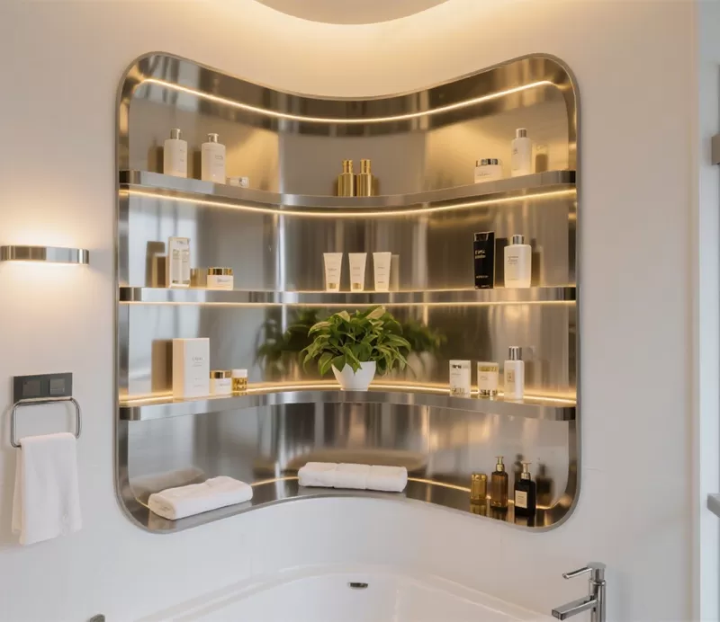 Case 1: A five-star hotel, while renovating their bathroom, sought a space that was both practical and modern. We custom-designed this alcove with curved corners made of 316 stainless steel, featuring a unique mirror-polished finish that gleams under the light. The layered design not only accommodates a large amount of toiletries but also provides space for plants, creating a fusion of freshness, nature, and high-end luxury upon entering the bathroom.