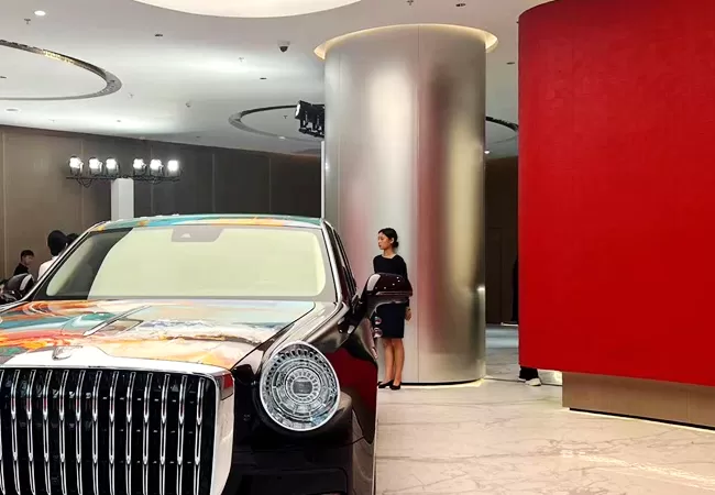 The column claddings, wall panels, vehicle display platforms, and stainless-steel façade are engineered with A-class fire resistance and zero-gap jointing, ensuring structural rigidity and refined detail. Laser-engraved brand-exclusive patterns and concealed LED lighting introduce a sophisticated glow that enhances visual hierarchy and strengthens brand identity.