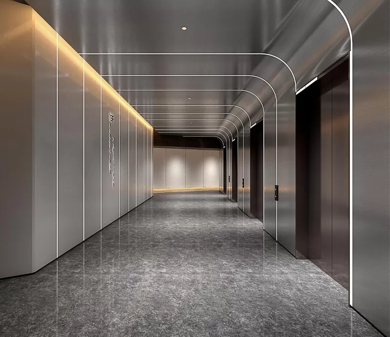 Stainless steel honeycomb panels are used for the elevator lobby walls. Their lightweight, high-strength structure resists daily impact, while their stain-resistant, easy-to-clean metallic finish imbues the confined space with a cool, technological feel and a warm, human touch. Sandblasted stainless steel honeycomb panels adorn the elevator lobby walls. The sand-grained texture eliminates fingerprints, while diffusely reflecting light softens the spatial boundaries. Every elevator ride is an aesthetic encounter between light and texture.