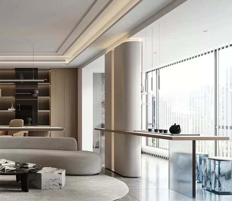 The curved design of the columns cleverly eliminates any sense of abruptness, creating a soft and elegant spatial aesthetic that blends seamlessly into the living room.