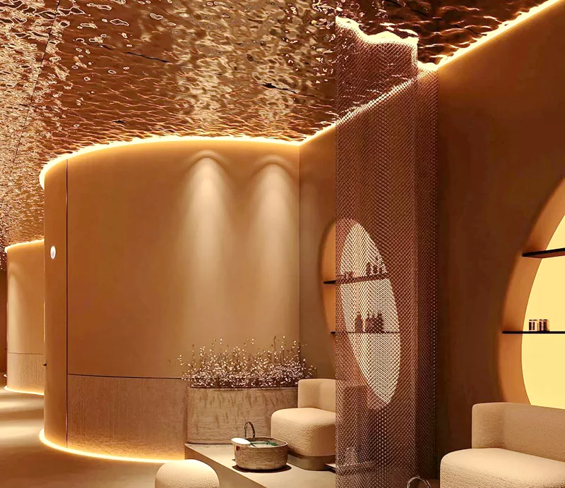 Available in mirror, brushed, and PVD color finishes (gold, rose gold, black, bronze), water ripple ceiling panels offer exceptional durability, corrosion resistance, and long lifespan. Their lightweight structure and customizable shapes make them suitable for complex architectural designs, especially in hotel lobbies, luxury retail stores, restaurants, elevators, and airport terminals.