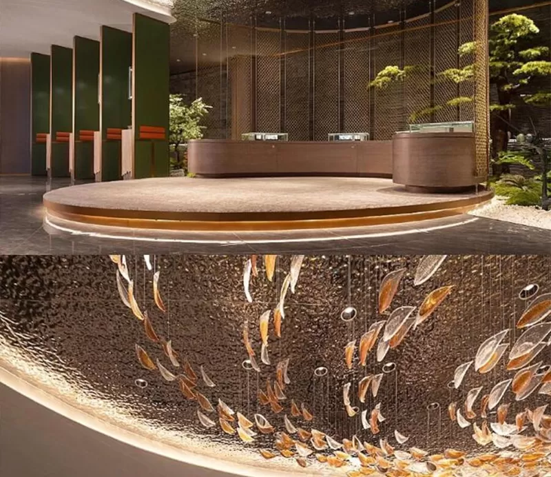 Water ripple stainless steel ceilings come in a variety of colors: in addition to the original color of stainless steel, they can also be plated to create a variety of colors, such as rose gold, bronze, black, etc., to meet the color needs of different spaces.
