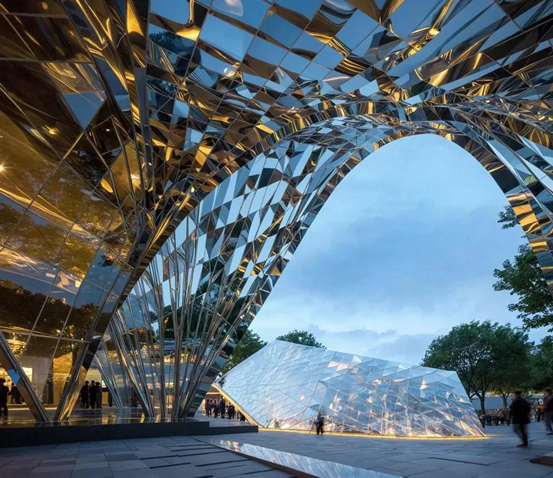 | Modern minimalist gallery | Stainless steel/aluminum alloy | Clean lines and bright surfaces emphasize the interweaving of blocks and the contrast of light and shadow. | Commercial complex, city park |